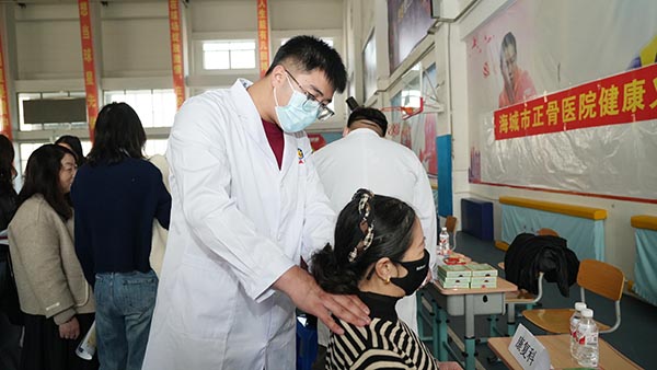 2月27日,在营口实验学校体育馆里,来自海城市正骨医院的义诊团队正在为学校的教职员工进行健康义诊。
